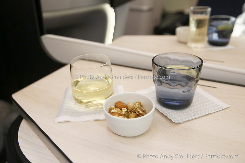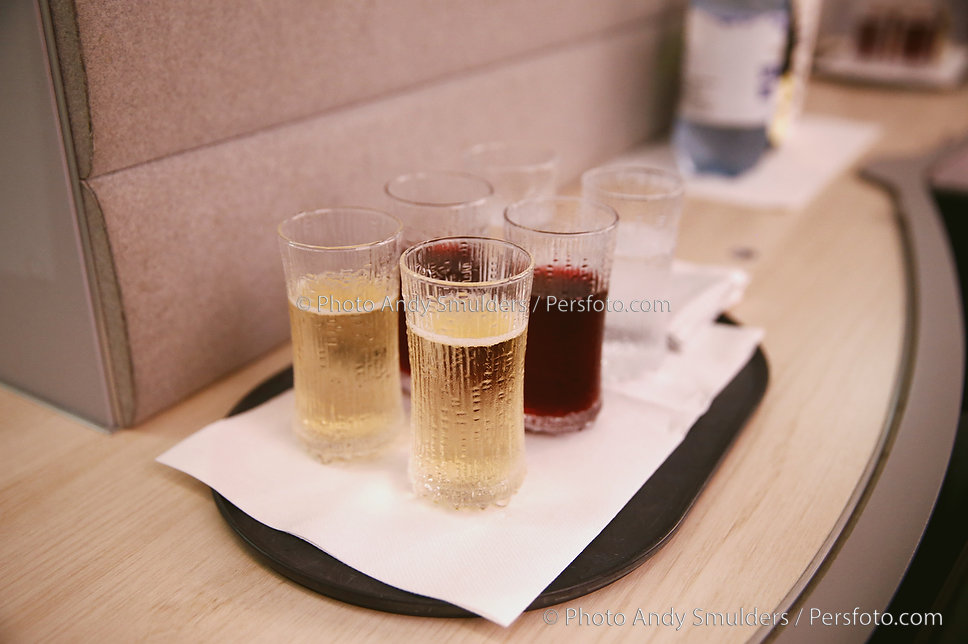 15-09-2025 TRAVEL: FINNAIR BUSINESS CLASS SPECIAL NAAR SINGAPORE. De A350-941 met registratie OH-LWF vloog ons van Amsterdam naar Helsinki en van Singapore naar Helsinki. Op de foto is de Business Class-service van Finnair te zien tijdens de vlucht. De stoelen kunnen weliswaar niet achterover leunen in de traditionele zin, maar laten zich omvormen tot een volledig vlak bed, met uitzonderlijk veel privacy. Op de foto een welkoms drankje. Copyrights Foto Andy Smulders / Persfoto.com