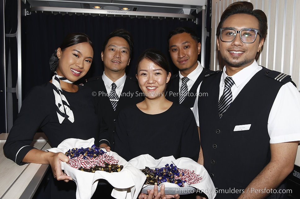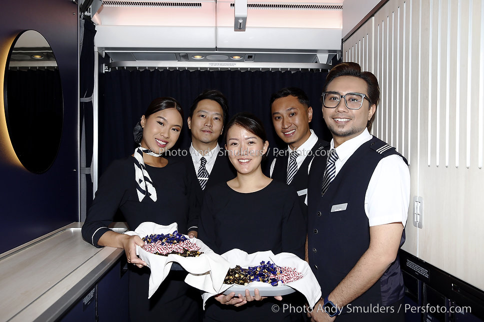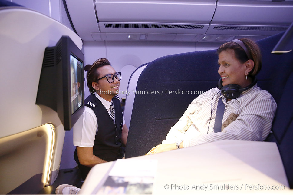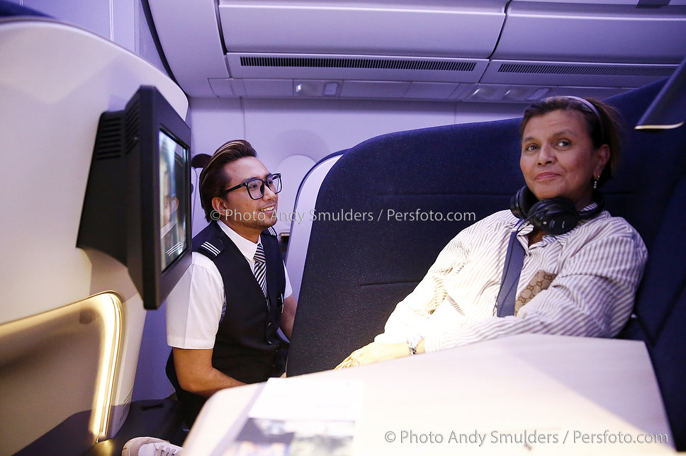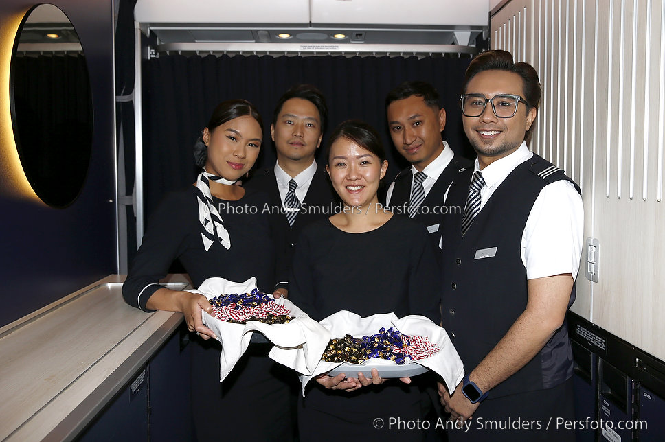 15-09-2025 TRAVEL: FINNAIR BUSINESS CLASS SPECIAL NAAR SINGAPORE. De A350-941 met registratie OH-LWF vloog ons van Amsterdam naar Helsinki en van Singapore naar Helsinki. Op de foto is de Business Class-service van Finnair te zien tijdens de vlucht. De stoelen kunnen weliswaar niet achterover leunen in de traditionele zin, maar laten zich omvormen tot een volledig vlak bed, met uitzonderlijk veel privacy. Op de foto de Stewardessen en Stewards. Copyrights Foto Andy Smulders / Persfoto.com