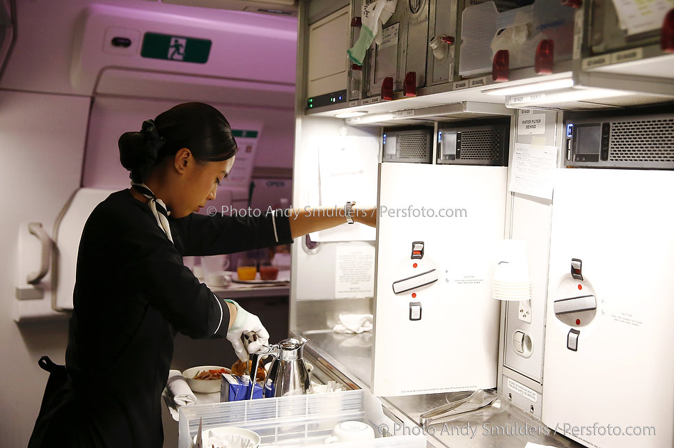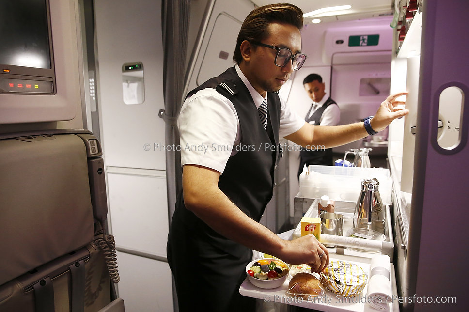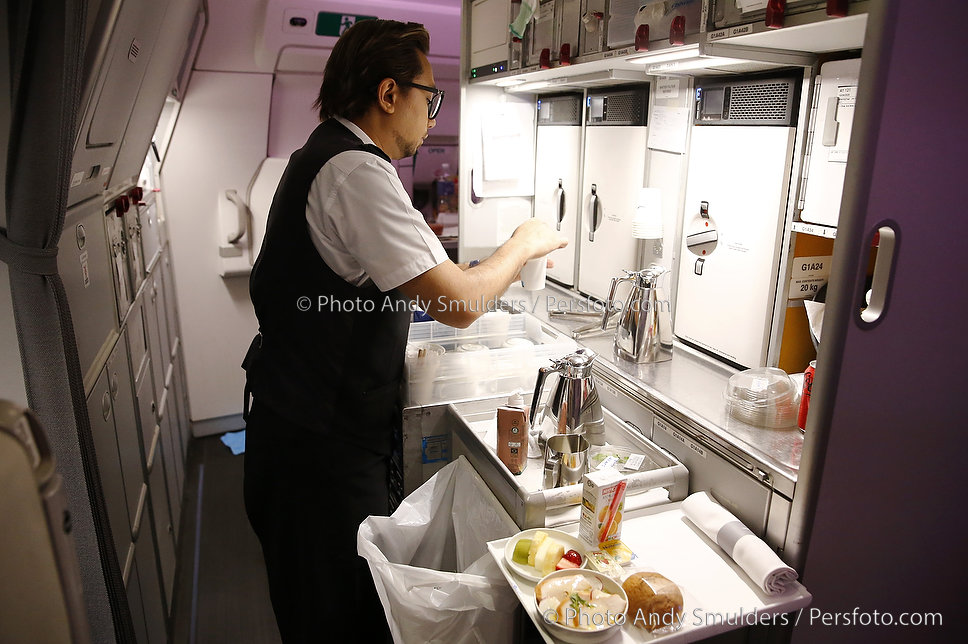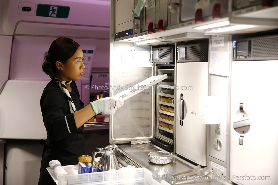 De Airbus A350-900 is uitgerust met moderne, compacte galley ovens waarin maaltijden worden opgewarmd met een combinatie van hete lucht en stoom, bedoeld om uitdroging te voorkomen. Terwijl een stewardess de instellingen controleerde op een digitaal schermpje, sorteerde haar collega het bestek en de glazen. Alles ging met een precisie die bijna chirurgisch aanvoelde.