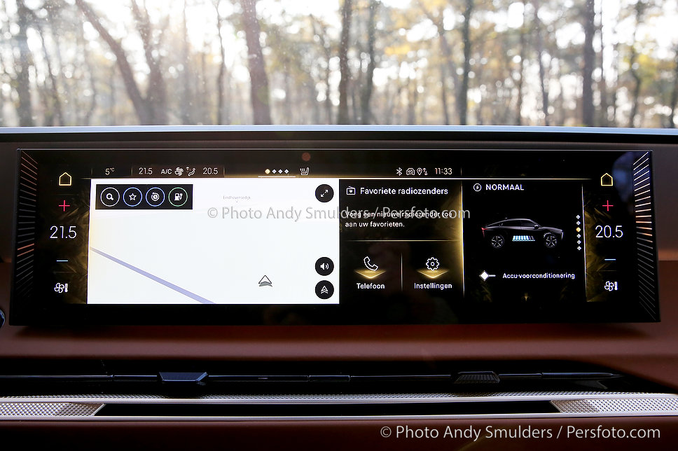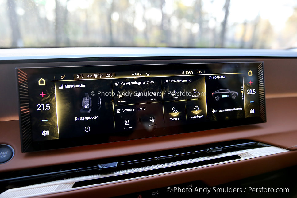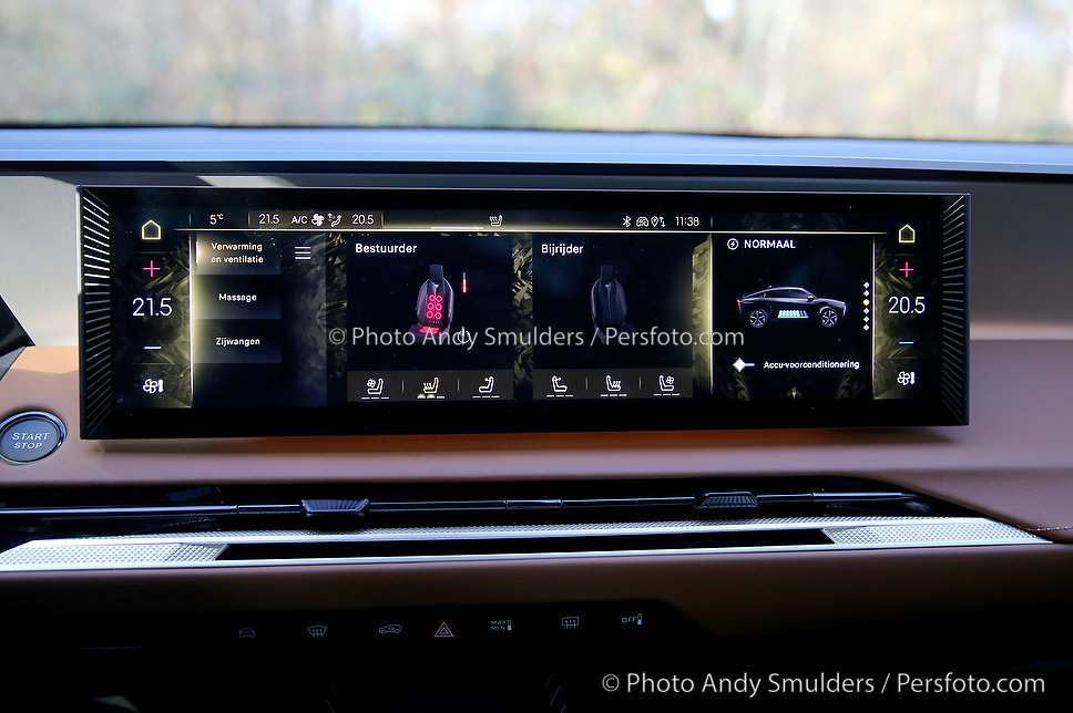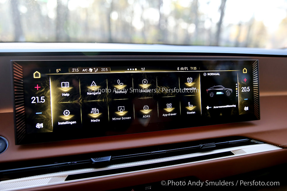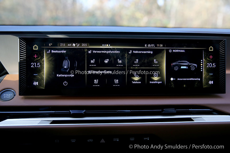 Het stuur voelt enigszins compact, en de vierspaaks uitvoering vraagt om een korte gewenning, je pakt het vaker op “kwart voor drie” in plaats van de traditionele “10 voor 2”-positie. Het dashboarddisplay is recht, waardoor sommige informatie net iets minder intuïtief zichtbaar is en het touchscreen in het midden vergt meerdere handelingen om functies te vinden. De bediening van bijvoorbeeld stoelverwarming of andere comfort opties is niet altijd even vlot. Het scherm reageert niet altijd even betrouwbaar op aanrakingen, het voelt alsof het systeem soms “twijfelt” welke functie geactiveerd moet worden. Dat merk je bijvoorbeeld bij de stoelverwarming, je kiest stand 1, 2 of 3, maar vaak registreert het scherm de aanraking niet nauwkeurig, waardoor het even duurt voordat de juiste instelling wordt geselecteerd. De touch-interface is er een met een beetje een ingebouwde geduldsoefening.