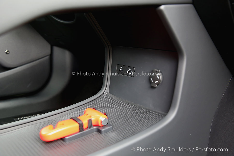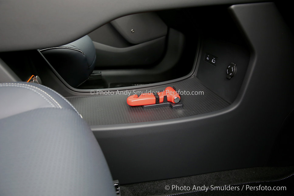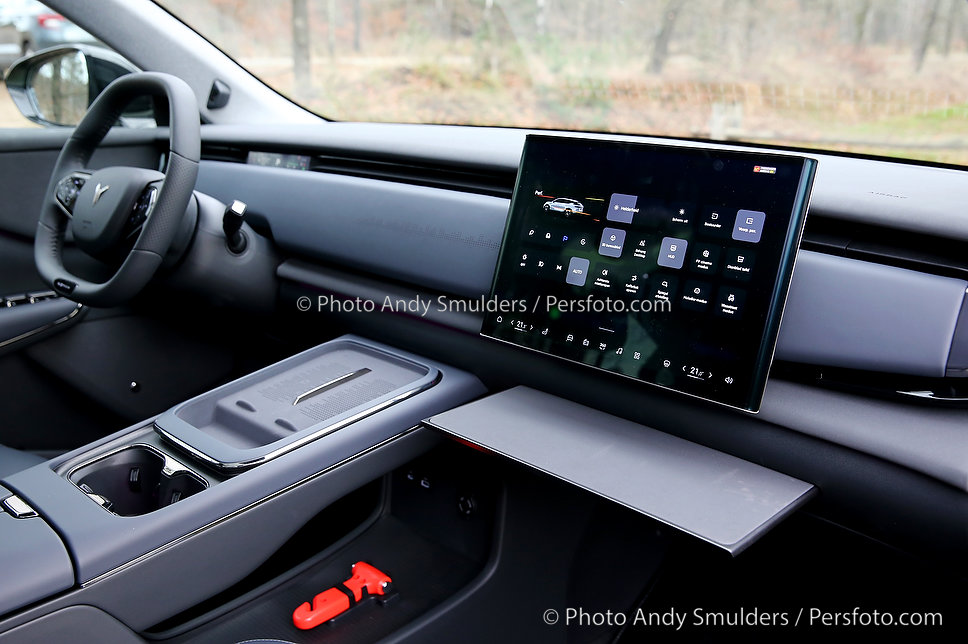 Voor de voorpassagier klapt een klein tafeltje uit het dashboard, handig om iets op te zetten.