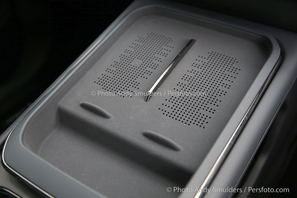 De luchtgekoelde telefoonoplader is netjes geïntegreerd; alleen het linker gedeelte laadt actief, terwijl de rechter zijde ideaal is om je telefoon koel weg te leggen.