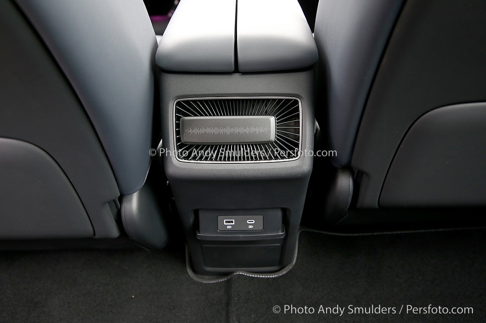 16-12-2025 VOYAH COURAGE RWD Business Edition E-SUV De Voyah Courage RDW Business Edition is een luxe elektrische SUV met achterwielaandrijving (RWD) en 292 pk, die concurreert met modellen als de Tesla Model Y, Hyundai IONIQ 5 en Kia EV6. Op de foto het Interieur van de auto met de achterbank ventilatie en USB -A en USB-C aansluiting. Copyrights Foto Andy Smulders / Persfoto.com