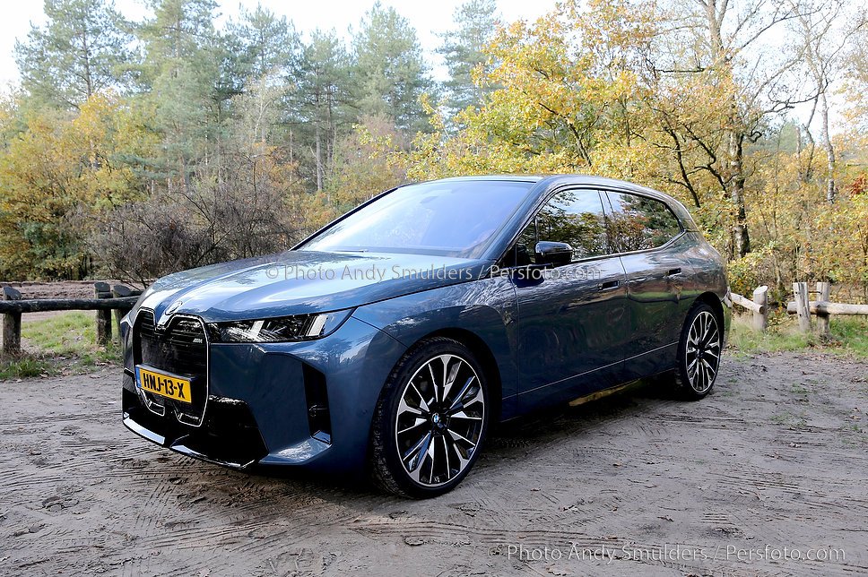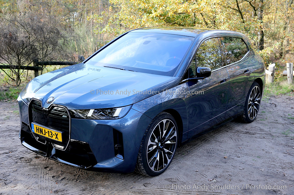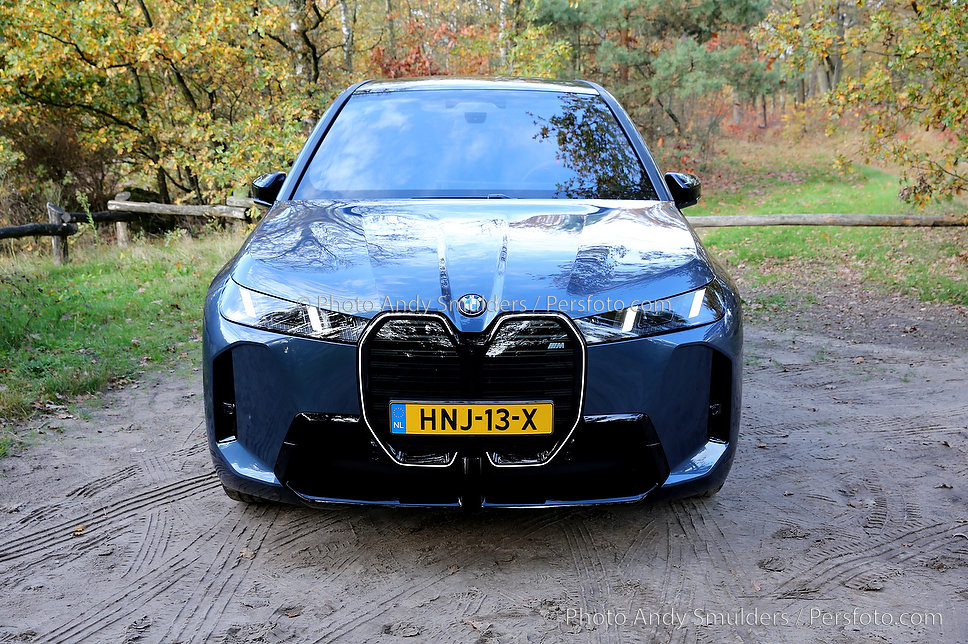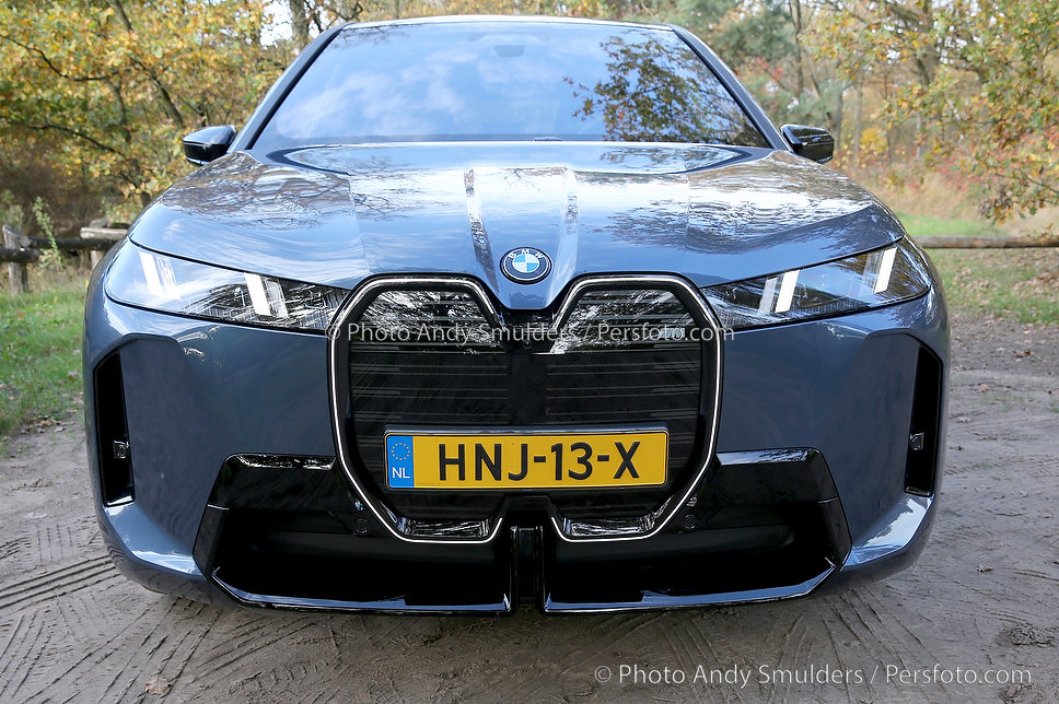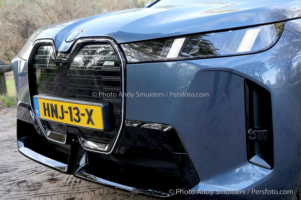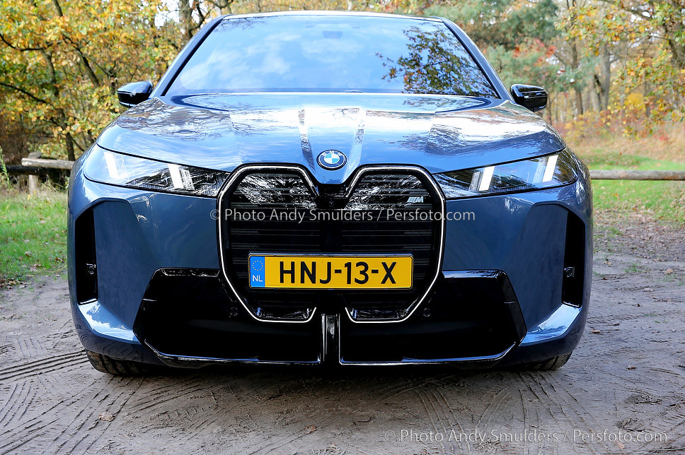 05-11-2025 BMW IX M70 XDRIVE De BMW iX M70 xDrive is een krachtige, volledig elektrische SUV die sportiviteit en luxe combineert. Op de foto het exterieur van de auto met de bekende verlichte BMW Nieren en met de 23 inch velgen in een herfst achtige omgeving. Copyrights Foto Andy Smulders / Persfoto.com
