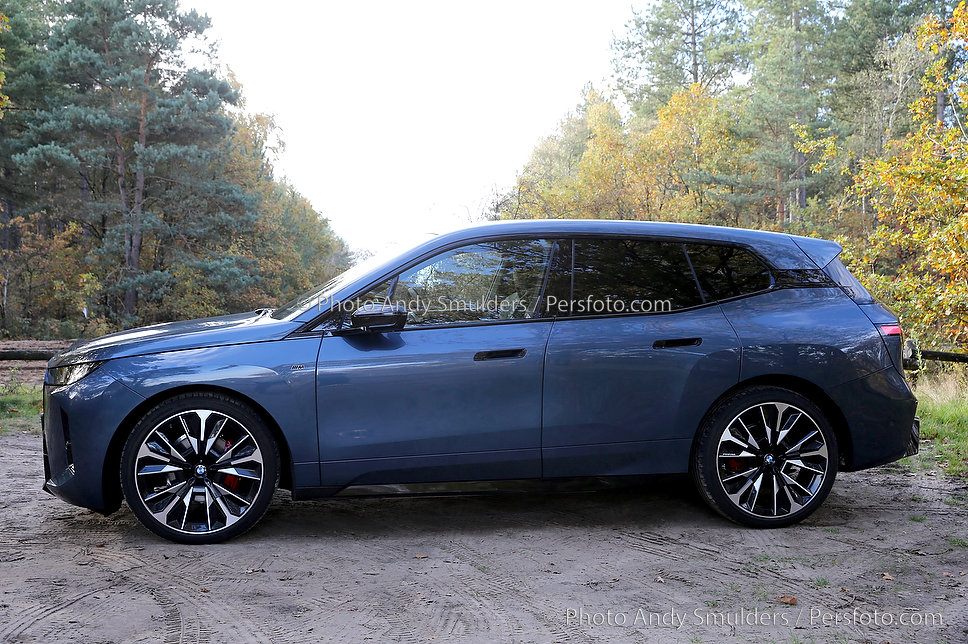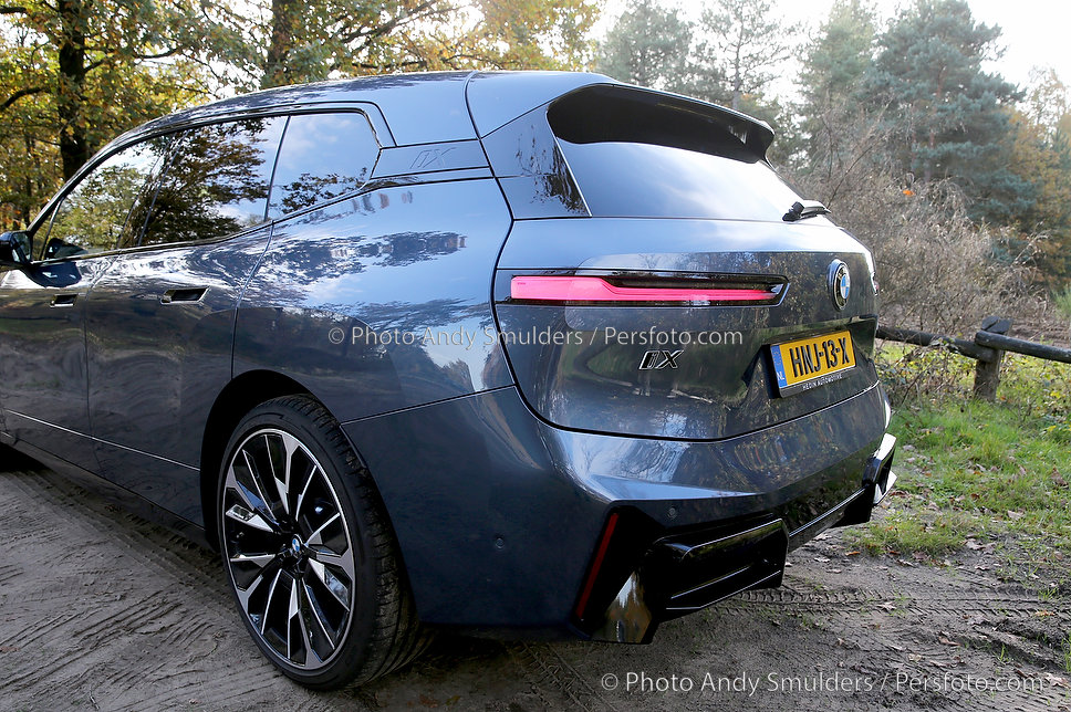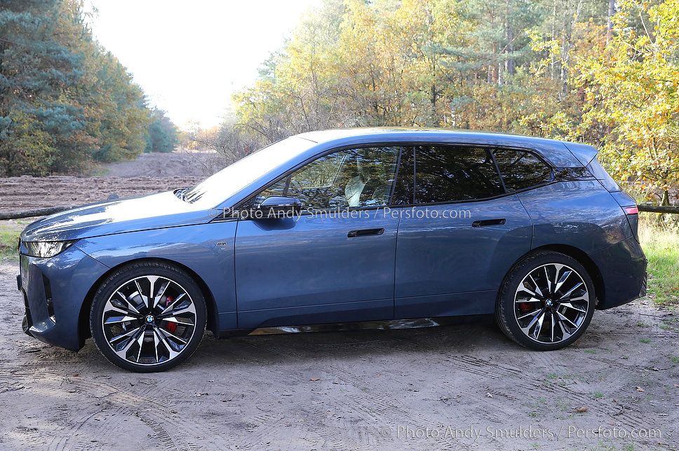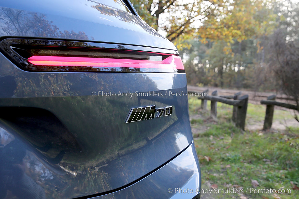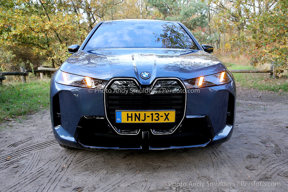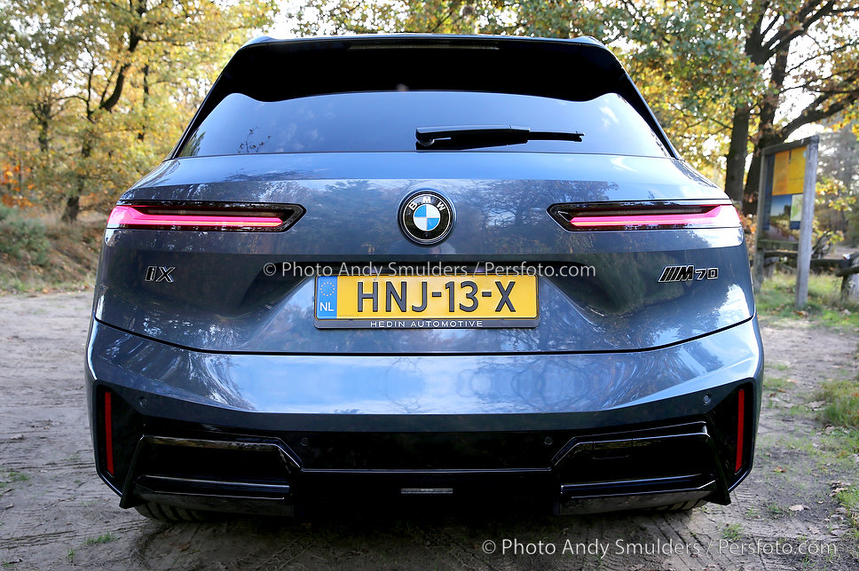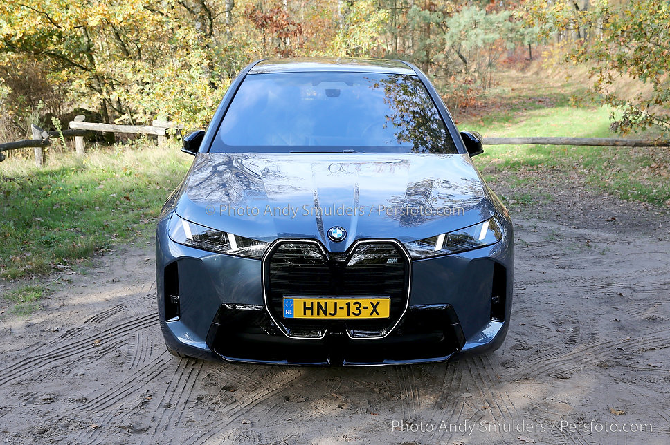 05-11-2025 BMW IX M70 XDRIVE De BMW iX M70 xDrive is een krachtige, volledig elektrische SUV die sportiviteit en luxe combineert. Op de foto het exterieur van de auto met de bekende verlichte BMW Nieren en met de 23 inch velgen in een herfst achtige omgeving. Copyrights Foto Andy Smulders / Persfoto.com