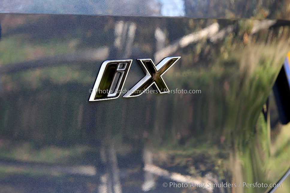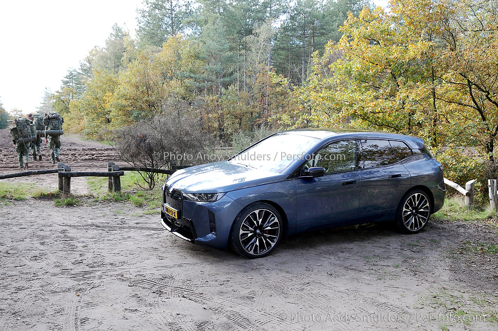 05-11-2025 BMW IX M70 XDRIVE De BMW iX M70 xDrive is een krachtige, volledig elektrische SUV die sportiviteit en luxe combineert. Op de foto het exterieur van de auto met de 23 inch velgen in een herfst achtige omgeving en 3 militairen. Copyrights Foto Andy Smulders / Persfoto.com