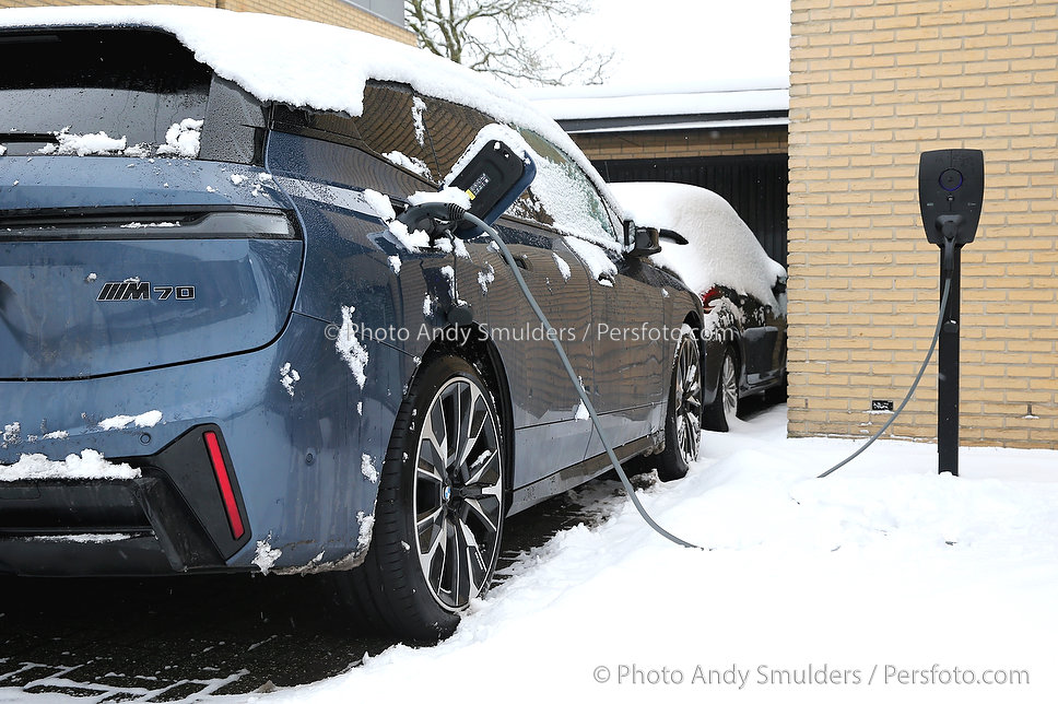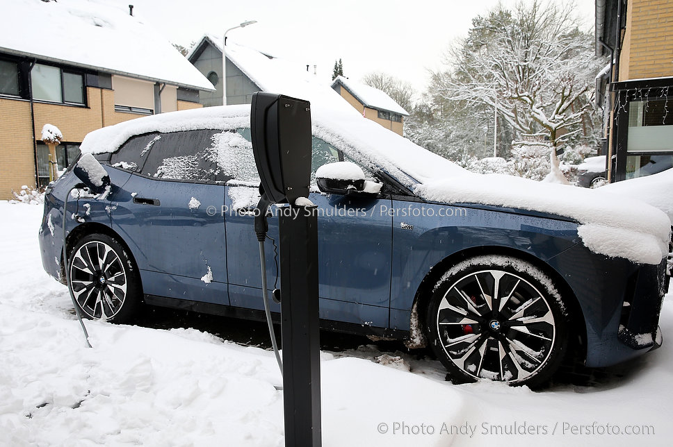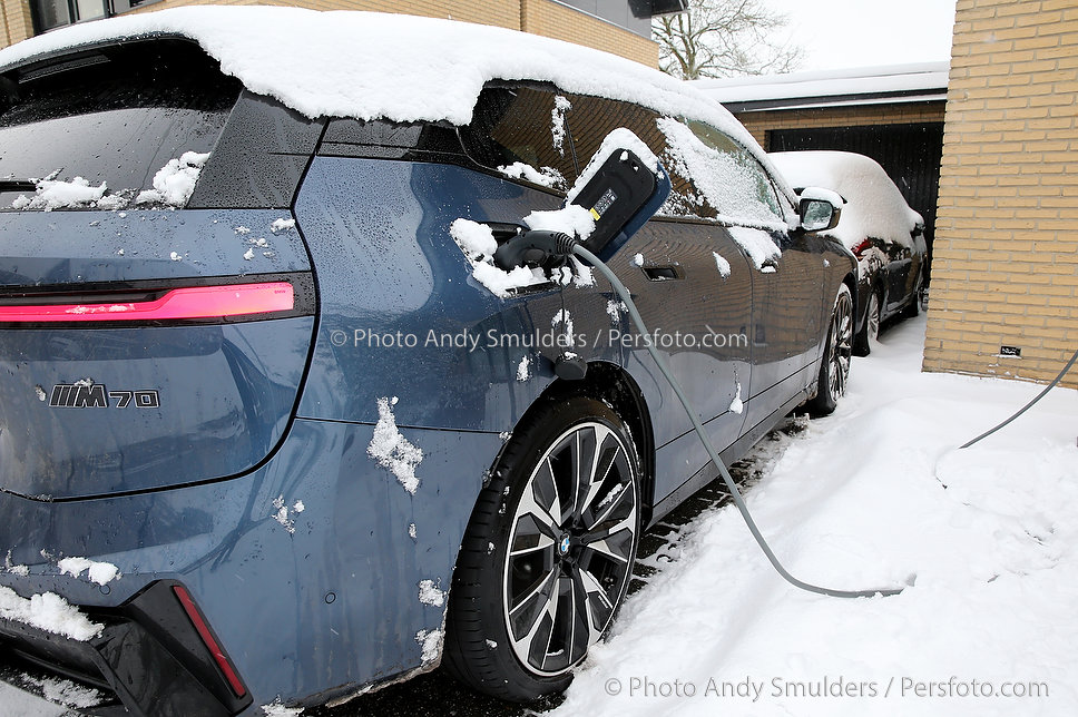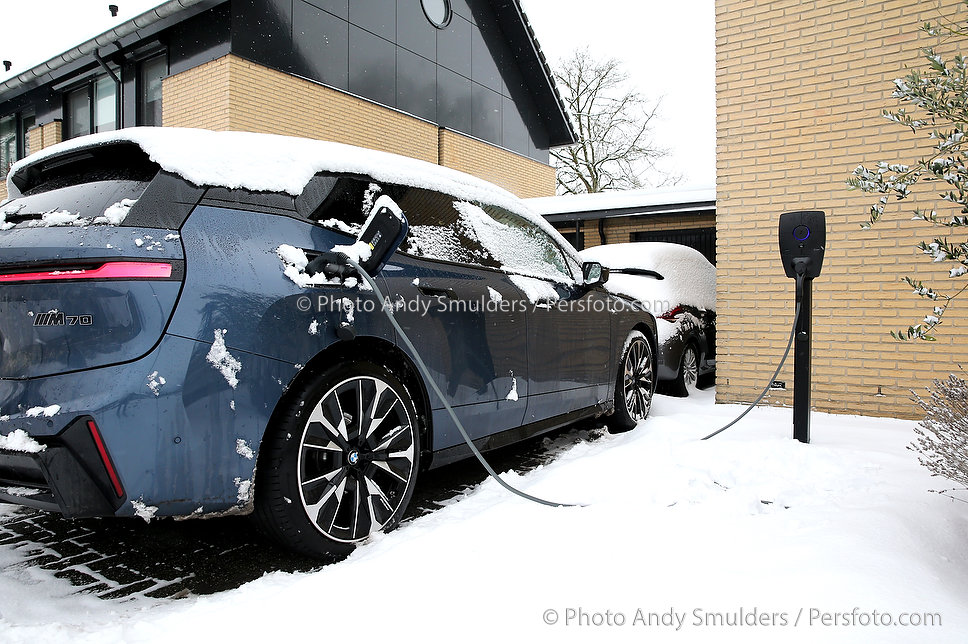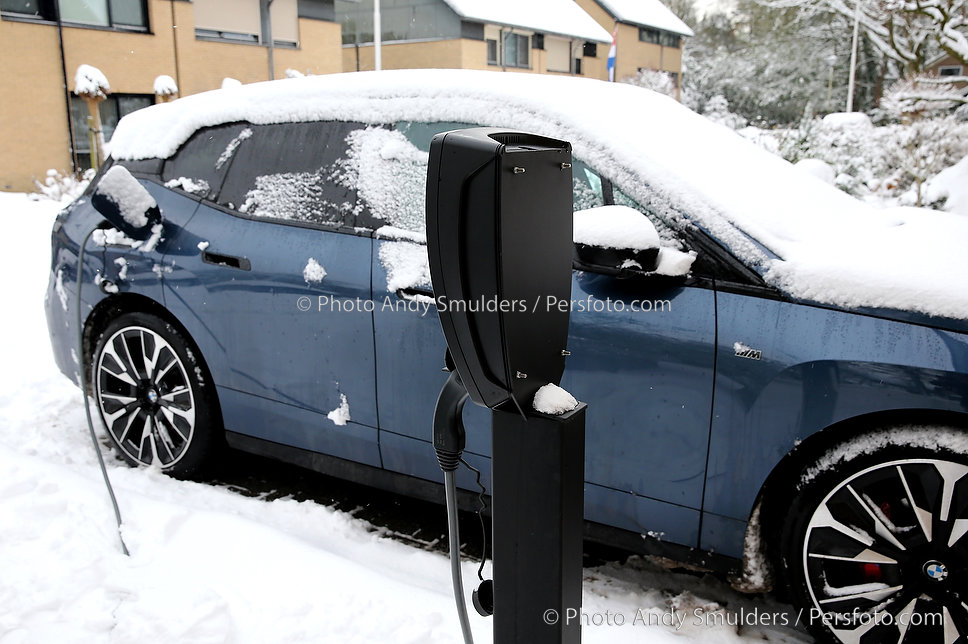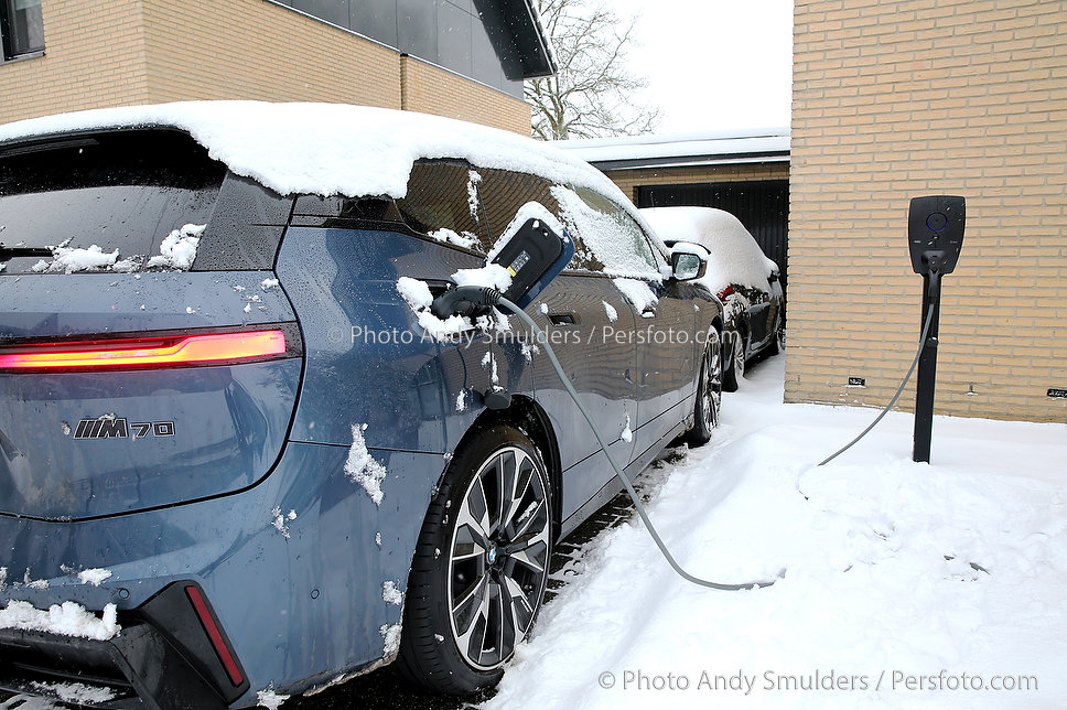 07-01-2026 BMW IX M70 XDRIVE IN DE SNEEUW De BMW iX M70 xDrive is een krachtige, volledig elektrische SUV die sportiviteit en luxe samenbrengt. Op de foto wordt de auto thuis opgeladen in winterse omstandigheden in de sneeuw, aan een openbare Zaptec-laadpaal van 22 kW. Dankzij de standaard 22 kW boordlader van de M70 kan snel worden geladen, al ligt het stroomverbruik in de winter hoger en moet je daardoor vaker de auto opladen aan de oplader. Copyrights Foto Andy Smulders / Persfoto.com