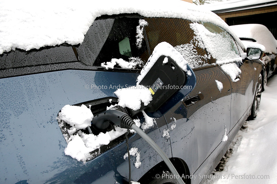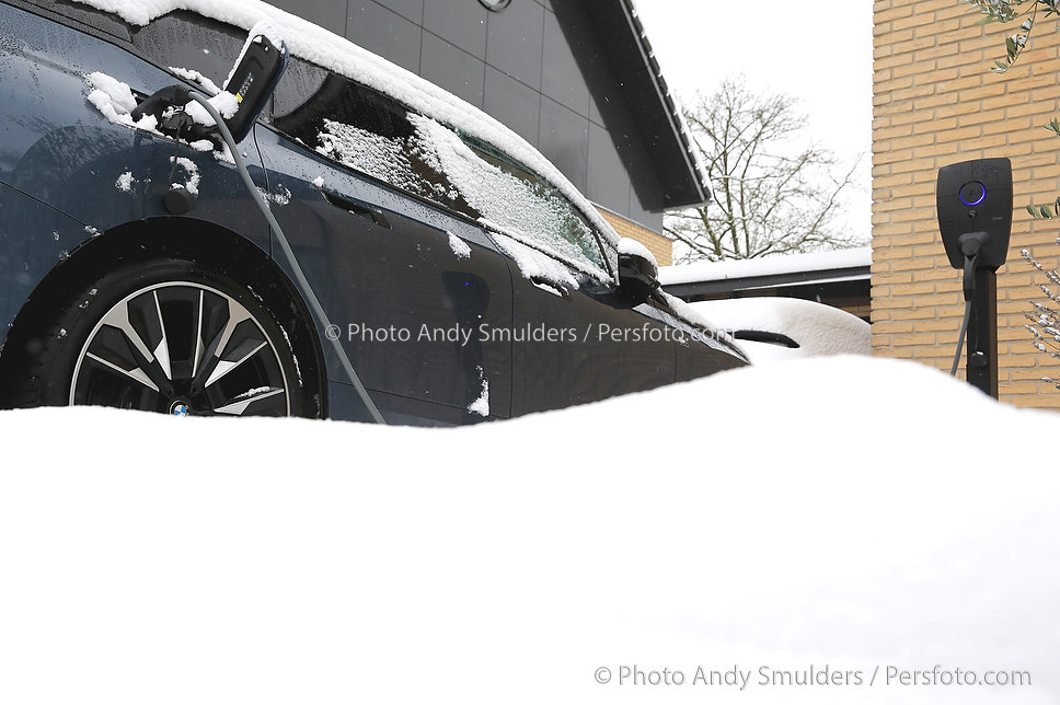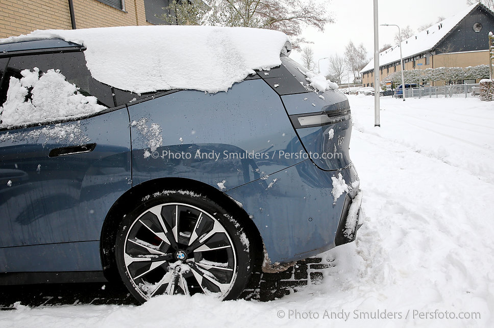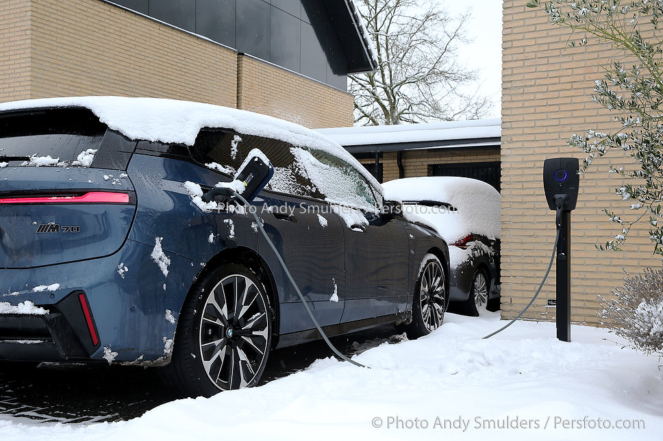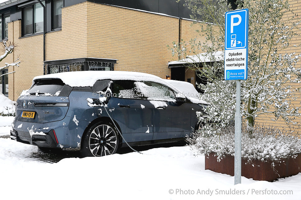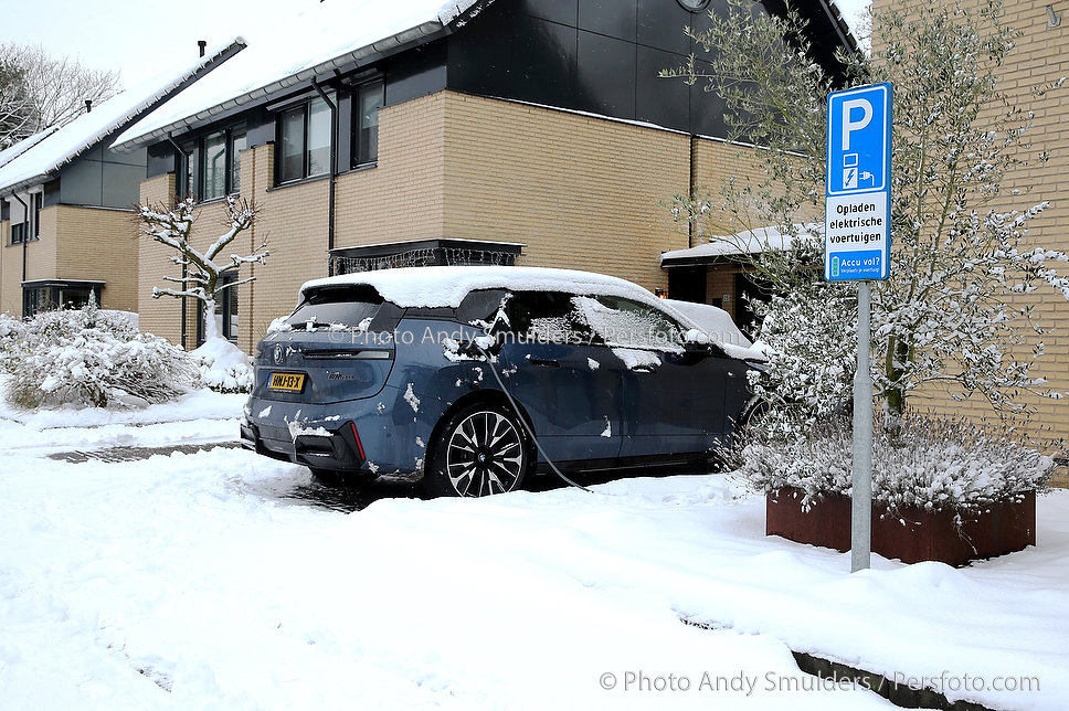 07-01-2026 BMW IX M70 XDRIVE IN DE SNEEUW De BMW iX M70 xDrive is een krachtige, volledig elektrische SUV die sportiviteit en luxe samenbrengt. Op de foto wordt de auto thuis opgeladen in winterse omstandigheden in de sneeuw, aan een openbare Zaptec-laadpaal van 22 kW. Dankzij de standaard 22 kW boordlader van de M70 kan snel worden geladen, al ligt het stroomverbruik in de winter hoger en moet je daardoor vaker de auto opladen aan de oplader. Copyrights Foto Andy Smulders / Persfoto.com