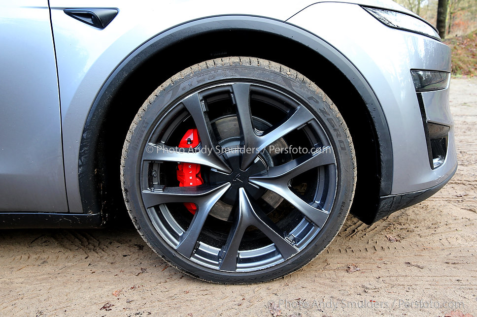 Het adaptieve onderstel is een van de grootste pluspunten van de Performance-versie. De keuze tussen Standard en Sport is goed voelbaar. In Standard is de auto verrassend comfortabel, terwijl Sport zorgt voor een strakker, directer rijgedrag met meer weggevoel. Het geoptimaliseerde chassis, de aangepaste ophanging en de nieuwe 21-inch Arachnid 2.0-velgen met verschillende bandenmaten 255/35R21 (voor) en 275/35R21 (achter) maken de Model Y Performance tot een plezierige en zeer capabele sportieve SUV. Tegelijkertijd merk je bij stevig doorrijden dat het gewicht en de hoge bouw niet te negeren zijn, vraag je net iets te veel, dan ligt overstuur op de loer. Gelukkig grijpt de ESP snel en effectief in.