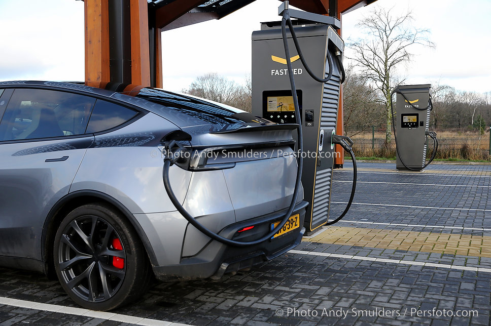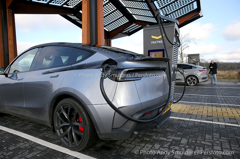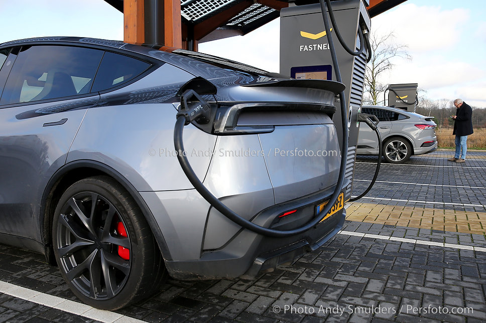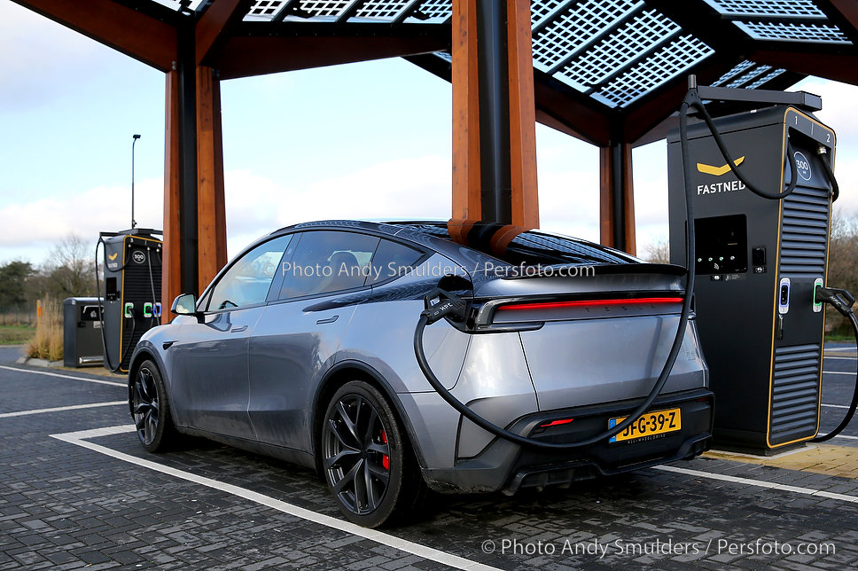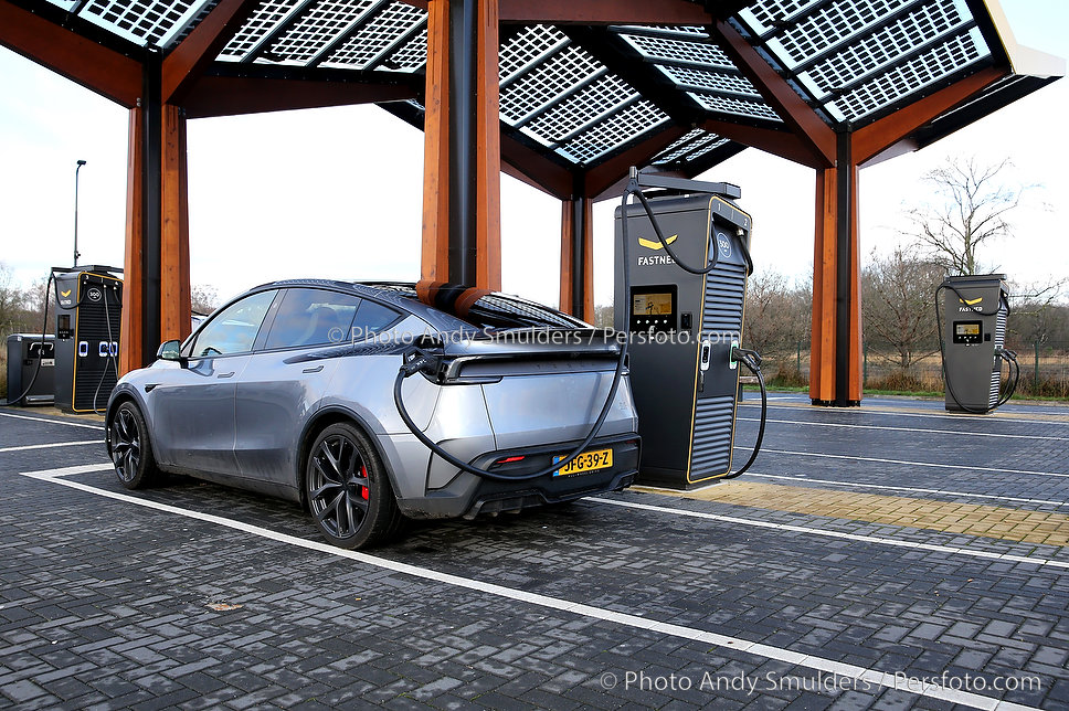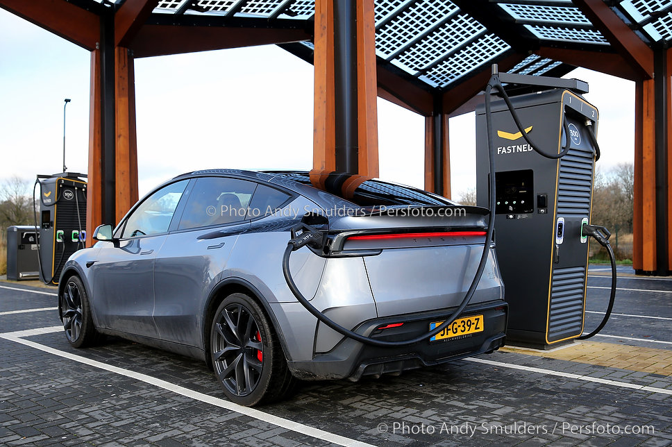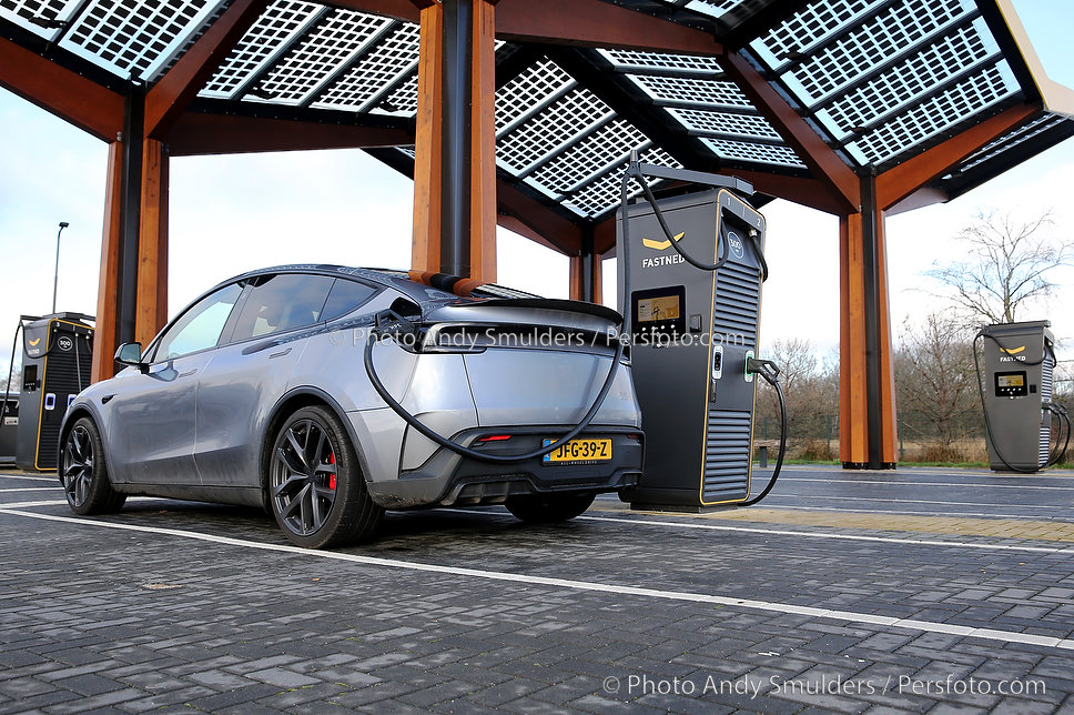 14-01-2026 TESLA MODEL Y JUNIPER PERFORMANCE Een sportieve, elektrische SUV met strakke, aerodynamische lijnen en een moderne uitstraling. Op de foto de Tesla aan het snelladen bij Fastned Kriekampen. Copyrights Foto Andy Smulders / Persfoto.com